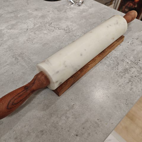 Oikein hyväkuntoinen kaulin. Jos kahvoja ei lasketa mukaan, niin kaulimella on pituutta reilu 25 cm. Sileä pinta kaulinosuudessa ja karheahkot muovikahvat hyvää pitoa varten.