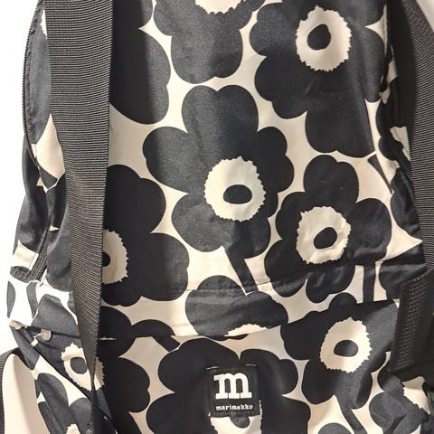 Marimekon Unikko selkäreppu, mustalla pohjalla vaaleanpunaisia kukkia. Lev. 40 cm, kork. 42 cm. Tukevat kantohihnat. Sisällä vetoketjullinen tasku.