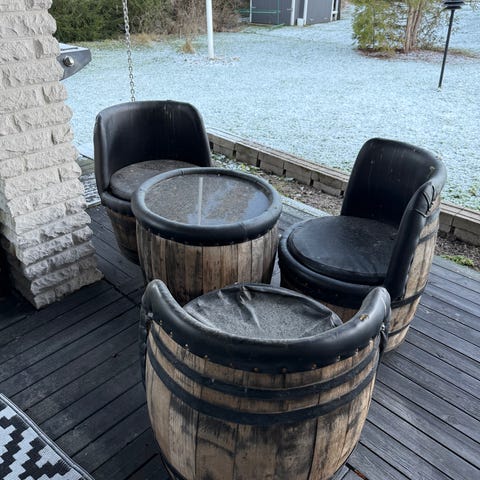 Myydään hyväkuntoiset tynnyrituolit 4 kpl, leveys 66cm, korkeus 45cm. Hinta 180e kpl.