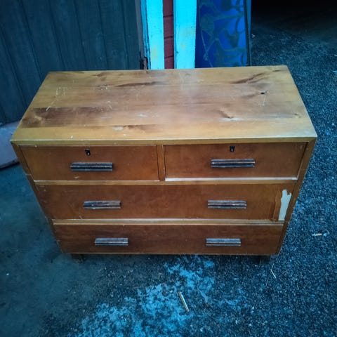 Vanha puinen lipasto, jossa peili ja kaksi sivukaappia. Lipastossa on useita vetolaatikoita ja säilytystilaa. Peilissä puurunko ja lasiosat, sivukaapeissa puiset ovet ja koristeelliset yksityiskohdat. Materiaali mänty tai vastaava puu.