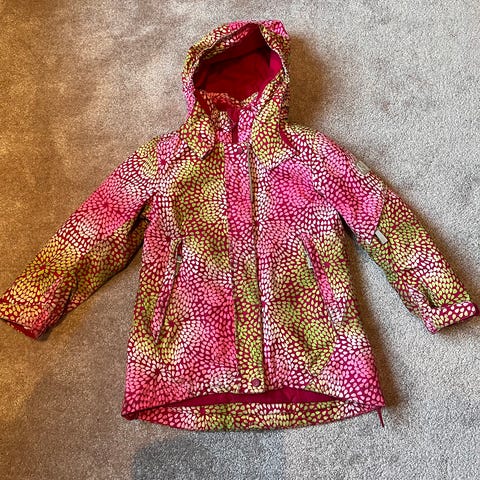 Pirteän kirkkaanvihreä Reima-merkkinen laskettelutakki koossa 122. Reimalle tyypillisesti reilua kokoa.