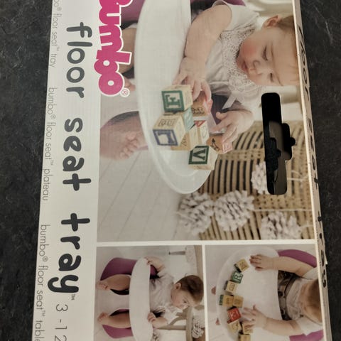 Myydään hyväkuntoinen harmaa Bumbo-istuin tarjottimella, minkä saa helposti irrotettua.