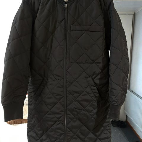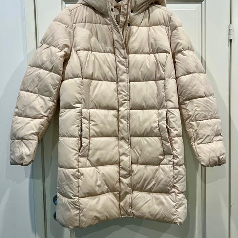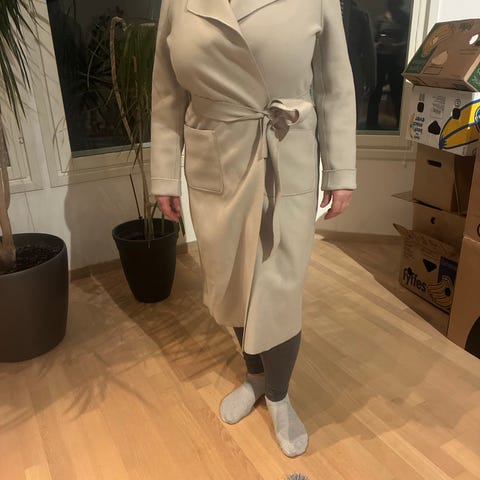 Lager 157 pitkä takki naisille, koko L. Takki on valmistettu polyesteristä ja väriltään beige.