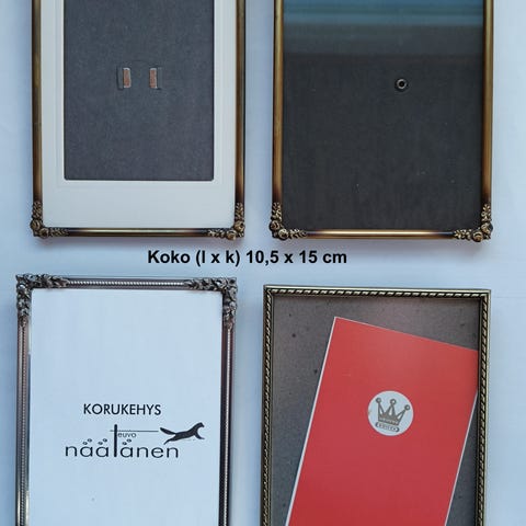 Hopea koristeellinen kuvakehys setti. Lasiosan koko 10cm X 15cm (2 kpl). Pienempi kehys: lasin koko 7cm x 7cm, minikehys 4cm x 5cm. Indiska. Setin hinta 15 euroa