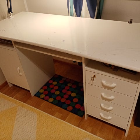 Valkoinen hyväkuntoinen kirjoituspöytä. Pinnassa pari pientä kolhua. Pöytälevyssä reikä johtoja varten.