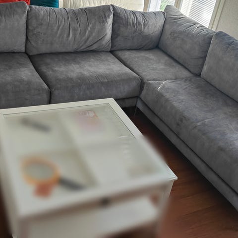 Harmaa iso kulmasohva jossa on irroitettavat istuinosat. Sohva on pehmeä. Päälliset myös irroitettavat.