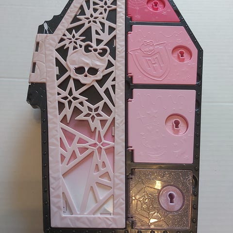 Monster High vaatekaappi/ kuljetusarkku, musta ja pinkki, muovimateriaalia. Sisällä vaatetanko ja hyllyjä. Korkeus 33cm.