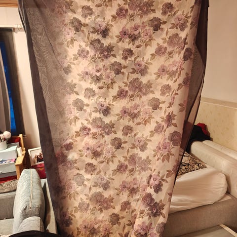 Vanhat kukkakuvioiset verhot uuteen kotiin. Päästävät valoa läpi. Pesun jälkeen taiteltu kaappiin, eli kaipaavat silitystä.