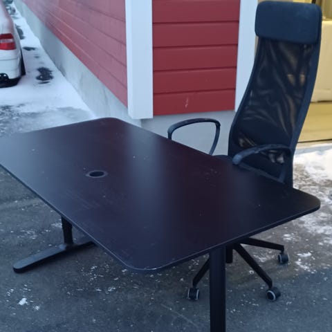 Ikean työpöytä bekant valkoisena. Kaksi pientä rikkinäistä kohtaa pinnassa, ei haittaa käyttöä eikä rakennetta.