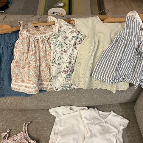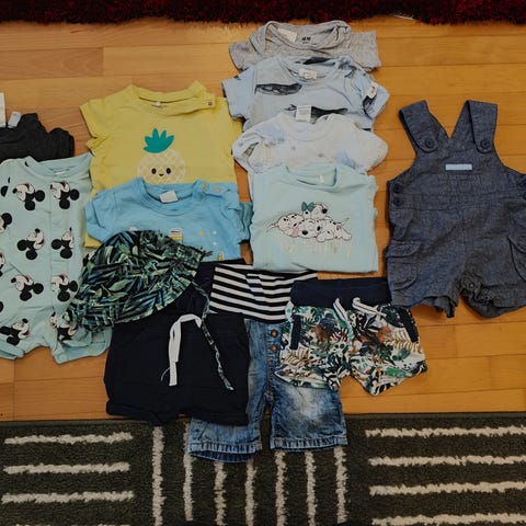 -Neljä lyhythihaista bodyä, yksi shortsihaalari ja kolmet ohuet housut.
