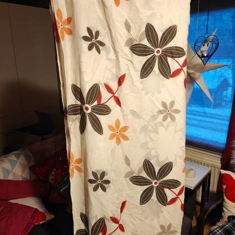Kauniit, valoa läpäisevät verhot seuraavaan kotiin. Kukkien väri lilan eri sävyissä, reunat tummempaa väriä. Pesun jälkeen taiteltu kaappiin ja siellä ovat muutaman vuoden lojuneet.