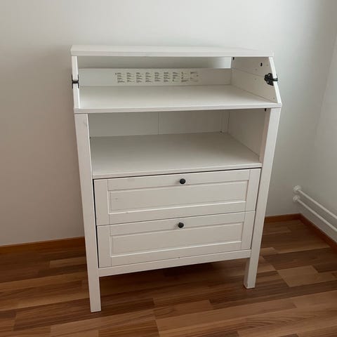 BRIO lastenhoitopöytä valkoinen. Hoitopöydässä on säilytystilaa laatikoissa ja avohyllyillä. Käytännöllinen kaluste lastenhoitoon.