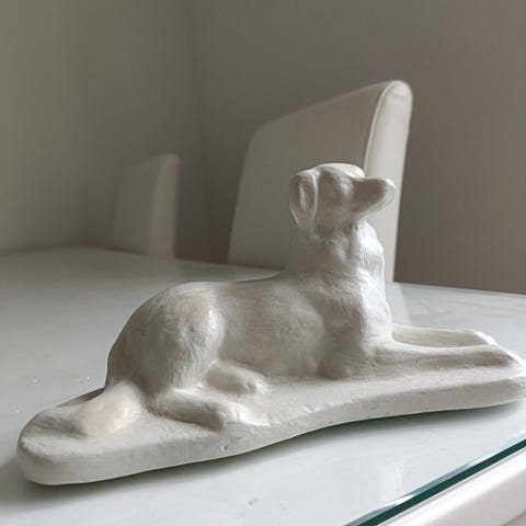 Keramiikkakoira patsas ruskeassa värissä. Sisustuselementti, joka esittää makaavaa koiraa. Materiaali keramiikka.