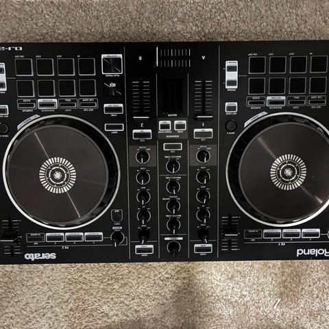 Roland DJ-202 DJ-kontrolleri musta. Laite sisältää kaksi pyörivää levyä ja useita säätimiä äänenhallintaan. Sopii DJ-käyttöön ja digitaaliseen musiikin sekoittamiseen.