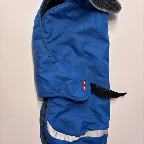 PerusPomppa on laadukas, lämmin ja vedenpitävä talvitakki teddyvuorilla. Takin niskassa on aukko talutinta varten. Takissa ei ole valjasaukkoa eikä jalkalenkkejä.