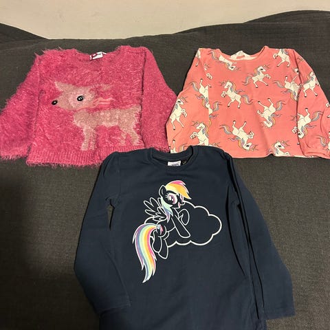 Pinkkejä hyväkuntoisia puuvillavaatteita yhteishintaan. My Little Pony T-paita, LoL pitkähihainen, Vendi kissapaita, Ciraf yksivärinen pitkähihainen, Ciraf joustavat farkut säädettävällä vyötäröllä ja Name it huppari.
