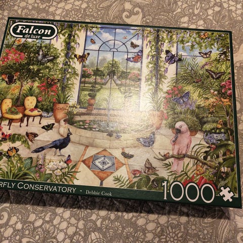 Tuhannen palan palapeli. Pari kertaa kasattu. Mukana voi tulla kissankarvoja. Kotelossa jälkiä.