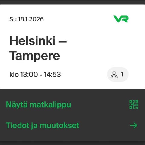 Myydään peruuntuneen reissun vuoksi aikuisen junalippu välille Tampere-Helsinki, la 17.1.2026 klo 13.00 lähtevään IC46 junaan.