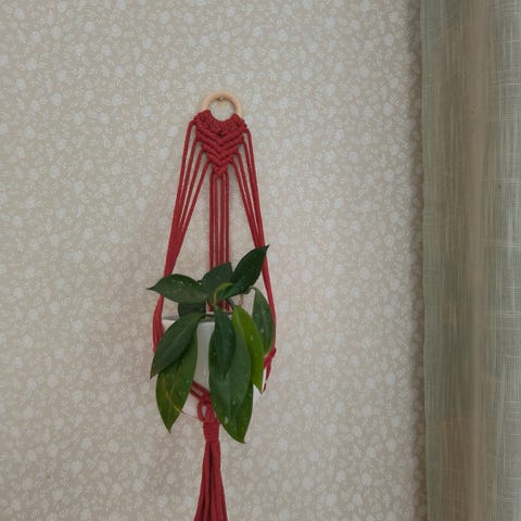 Vaalea makrameesolmeiltu amppeli kukkaselle.