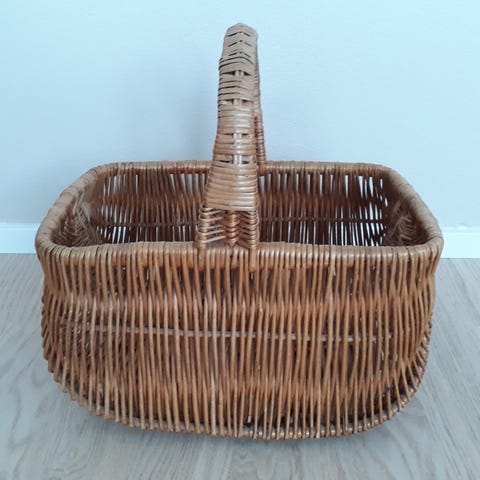 Rottinkinen kori kantokahvalla. Korin koko 44x28cm, koriosan korkeus (ilman kahvaa) 30cm, kokonaiskorkeus (kori+kantokahva) 45cm. Siisti, ei käytönjälkiä.