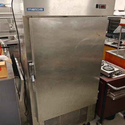 Metos ammattikäyttöinen pakastin ruostumattomasta teräksestä. Varustettu useilla hyllyillä säilytystilaa varten.