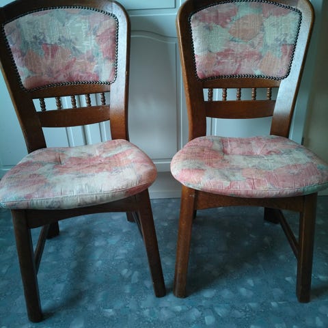 Annetaan 2 kpl vanhoja tuoleja. Kummassakin tuolissa kulma liitos irti. Näkyy kuvassa. Vaatii pienen liimauksen. Vain nouto.