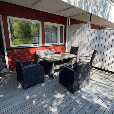 Pöytä ja kaksi tuolia ulkokäyttöön, joissa musta metallirunko. Pöydän kansi on lasia. Kalusto soveltuu parvekkeelle tai terassille. Hyvässä kunnossa. Voin pestä tuolin jalat ennen osto.