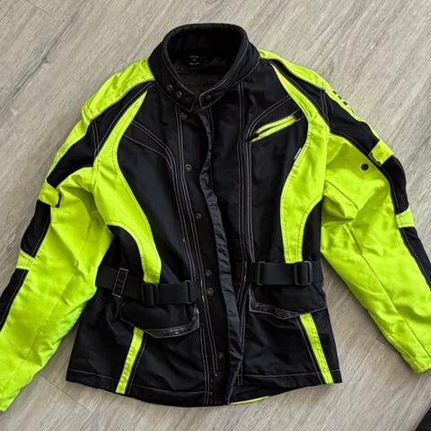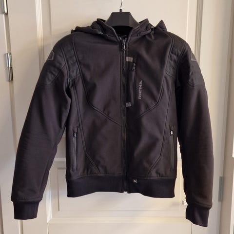 Richa moottoripyörätakki, väriltään musta, jossa valkoiset ja punaiset yksityiskohdat. Takissa on pitkä hiha ja vetoketjukiinnitys. Sopii moottoripyöräilyyn tarjoamaan suojaa ja käyttömukavuutta.