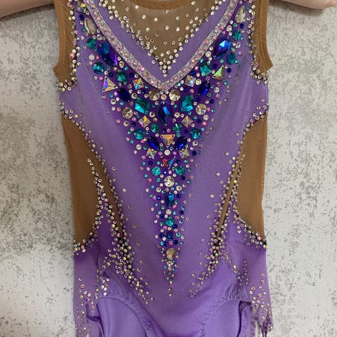 New leotard (my daughter has grown while waiting for the start of the competition season), for the girls 130-140 cm tall. Asymmetrical skirt.