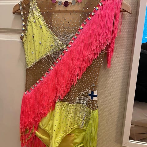 Uusi puku (kilpailukauden alkua odotellessa tyttäreni on kasvanut), 130-140 cm pitka tyttölle. Epäsymmetrinen hame.