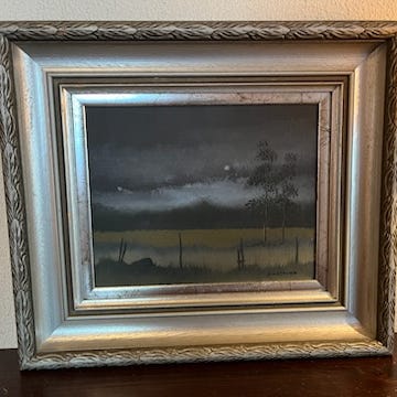 Taulu, jossa on metsämaisema ja eläimiä. Kehyksessä oleva taideteos, jossa näkyy metsää ja eläimiä luonnonympäristössä.