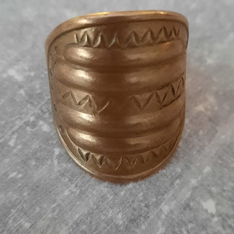 Kalevala korun pronssinen Perniön sormus, koko 18,5-19 ja venytettävissä suuremmaksi. Lievää käyttökulumaa, mutta yhä hyvin edustava ja lakkaus kunnossa.