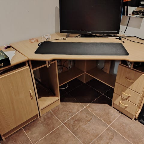 Tumma tietokone pöytä jossa puun värinen kansi. Vain nouto. Sijaitsee Seinäjoella.