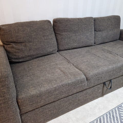 Harmaa vuodesohva, melko vähällä käytöllä ollut. Muutaman yön nukuttu. Koiratalous.