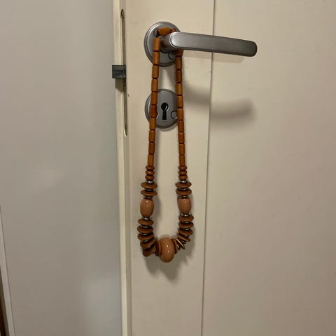 Aarikan vaaleanruskeat näyttävät puuhelmet joustavassa ketjussa, pituus n. 60 cm. Suurimman helmen halkaisija n. 3 cm. Kuin uudet.
