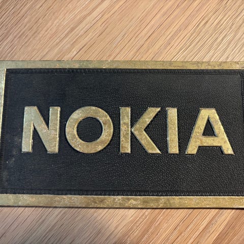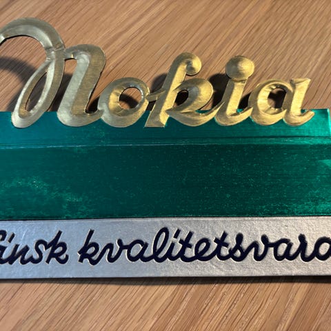 Nokia Logo-kyltti, suuri ja kolmiulotteinen, valmistettu valkoisesta ja mustasta materiaalista. Sopii esimerkiksi sisustukseen tai mainoskäyttöön.