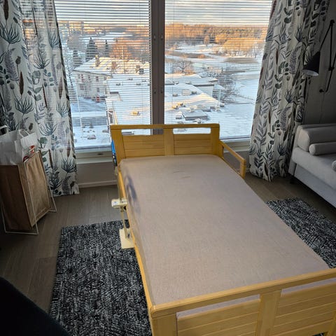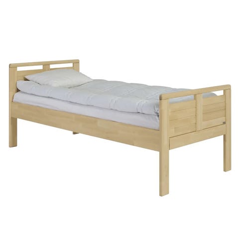 Kiteen seniorisänky valkoisella värillä. Irrotettava nousutuki. Patja, jossa pestävä patjan päällinen.