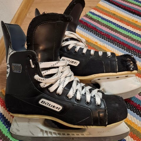Bauer jääkiekkoluistimet, koko 43. Bauer koko 8. Pohjallisen koko 27 cm. Ei ole montaa kertaa käytetty. Hyvä varmasti terottaa ennen käyttöä. Kulkeutuu jkl Seppä tai Minimani työmatkojen mukaan.