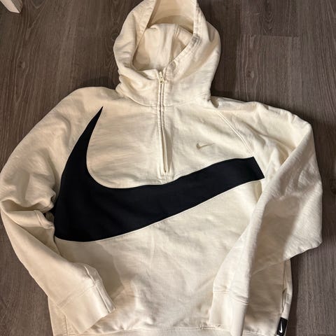 Nike miesten huppari, koko M, väriltään musta. Hupparissa vetoketju ja huppu, materiaali ei ole tiedossa. Soveltuu muuhun urheilukäyttöön. Vähän auringon ruskettamaa hupun sisällä ja pieniä ruhjeita ei löydy reikiä.