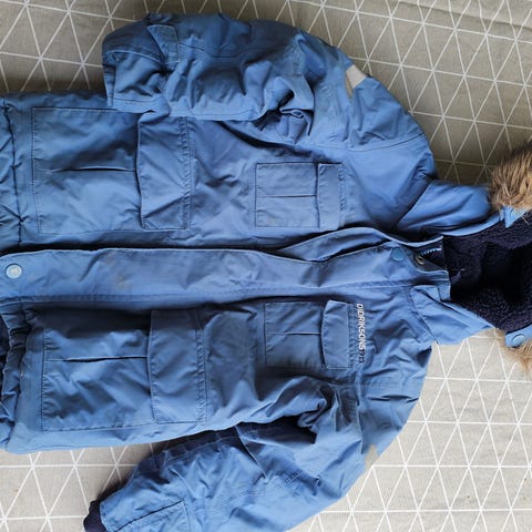 Myydään takki ja seuraavassa kuvassa näkyvät vaatteet yhtenä pakettina. Takki on neulospintaista materiaalia, koko 110.
