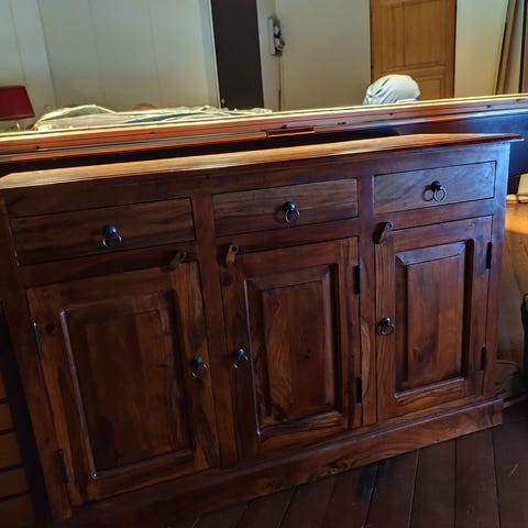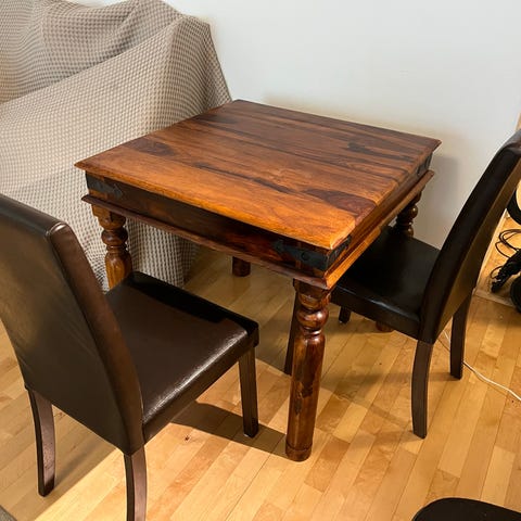 Akaasia sohvapöytä. Tullut meille uutena, savuton/eläimetön talous. Kannessa pari lasin jälkeä, muuten siisti. Neljä laatikkoa, yksi per sivu.