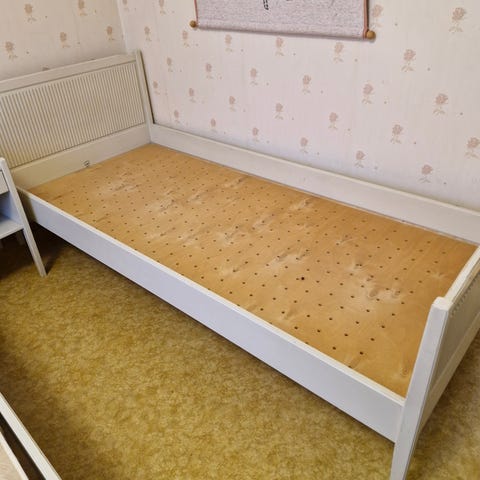 Metallinen parisänky, taustahylly yöpöydillä ja sängynaluslaatikko