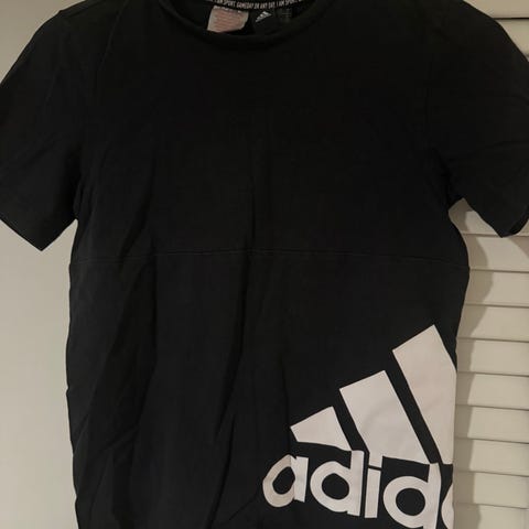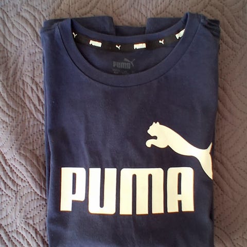 Musta Puma ja sininen Adidas t-paita. Punan merkki-painatus ehjä.