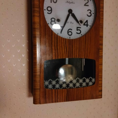 Delfiinikello, pöytäkello. Kello toimii. Noin 40 vuotta vanha. Muuten ehjä, mutta pintaan tullut jonkin verran krakelointia. Näkyy lähikuvassa, ei kauempaa. Leveys 41 cm, korkeus 24,5 cm ja syvyys noin 14 cm. Hinta 80 euroa.
