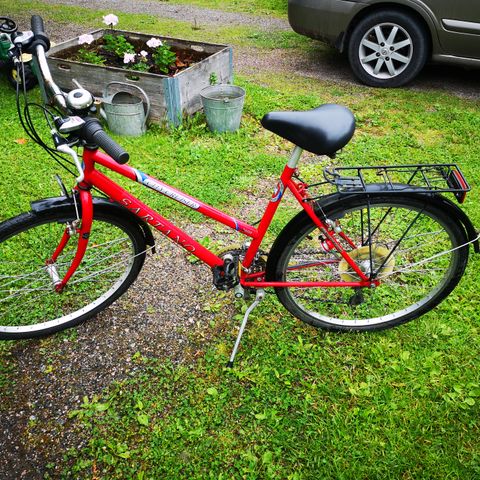 26 tuumainen Dyno Deuce cruiser-polkupyörä punaisella rungolla ja runsailla yksityiskohdilla. Pyörässä on leveät renkaat ja mukava satula, joka sopii rentoon ajamiseen.