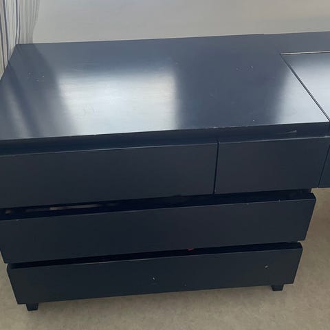 Hyväkuntoinen muuten, paitsi alimman ja keskimmäisen laatikon välissä oleva pinnoite osin irronnut.