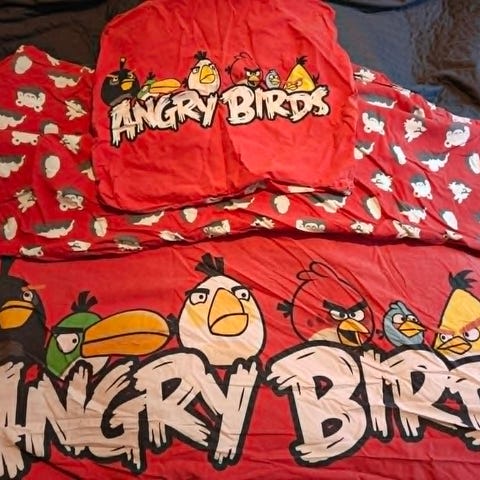 Angry Birds lasten pyyhe pussilakana ja tyynyliina. Pussilakanassa tahra, johon ei ole kokeiltu tahranpoistoa.