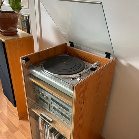 Normaalista poikkeava vintage levysoitinkaappi myytävänä. Toimintaa ei ole testattu. Mukana varaosia ja puhdistus tarvikkeita. Takakulmassa korjaus. Muilta osin kunto hyvä. Maadoittamaton pistoke. Toinen johto poikkaistu.