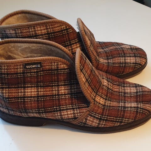 Täysin käyttämättömät Suomessa valmistetut reino tossut alkuperäisessä laatikossaan. Valmistaja Suomen kumitehdas, EI siis finnlaysonin uusiotuotantoa. Koko 44, mahtuu siis hyvin koon 45 jalkaan. Sijaitsee Lappeenrannassa, tarvittaessa toimituskulut lisätään hintaan.