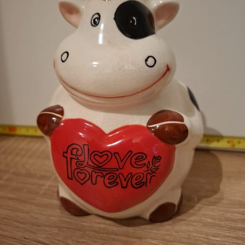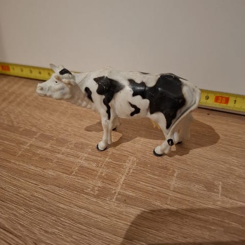 Pieni muovinen lehmälelu, mustavalkoinen väritys. Leveys noin 6 cm, tarkoitettu leikkiin tai keräilyyn.